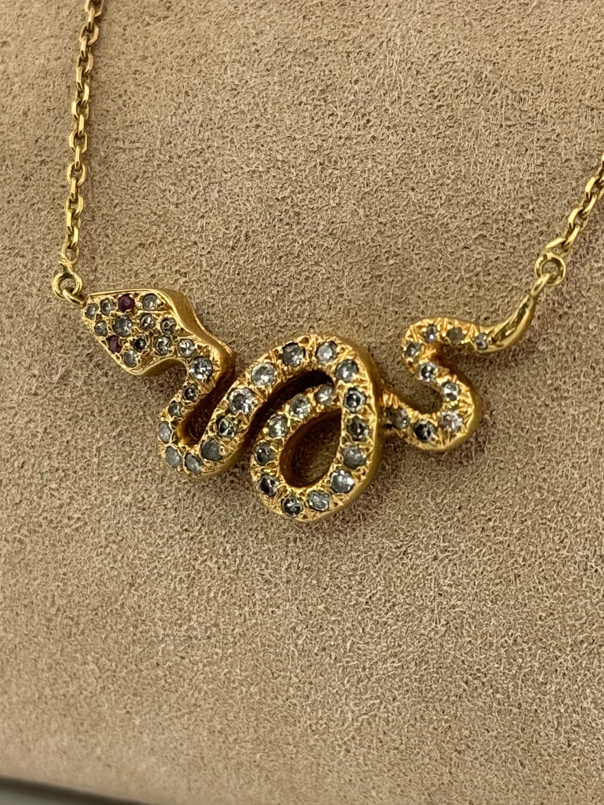 Antique natural diamond and gemstone snake animal necklace. This necklace is from the Victorian era and is made of 18kt yellow gold. There is roughly .65 carats of natural diamonds and .02 carats of natural ruby to mimic the snakes eyes. The diamonds are single cut and one stone is an older transitional cut the quality is majority Si. The snake pendant is connected to the original chain and is a cable design. The necklace is 16 inches long but can be extended with newer links.