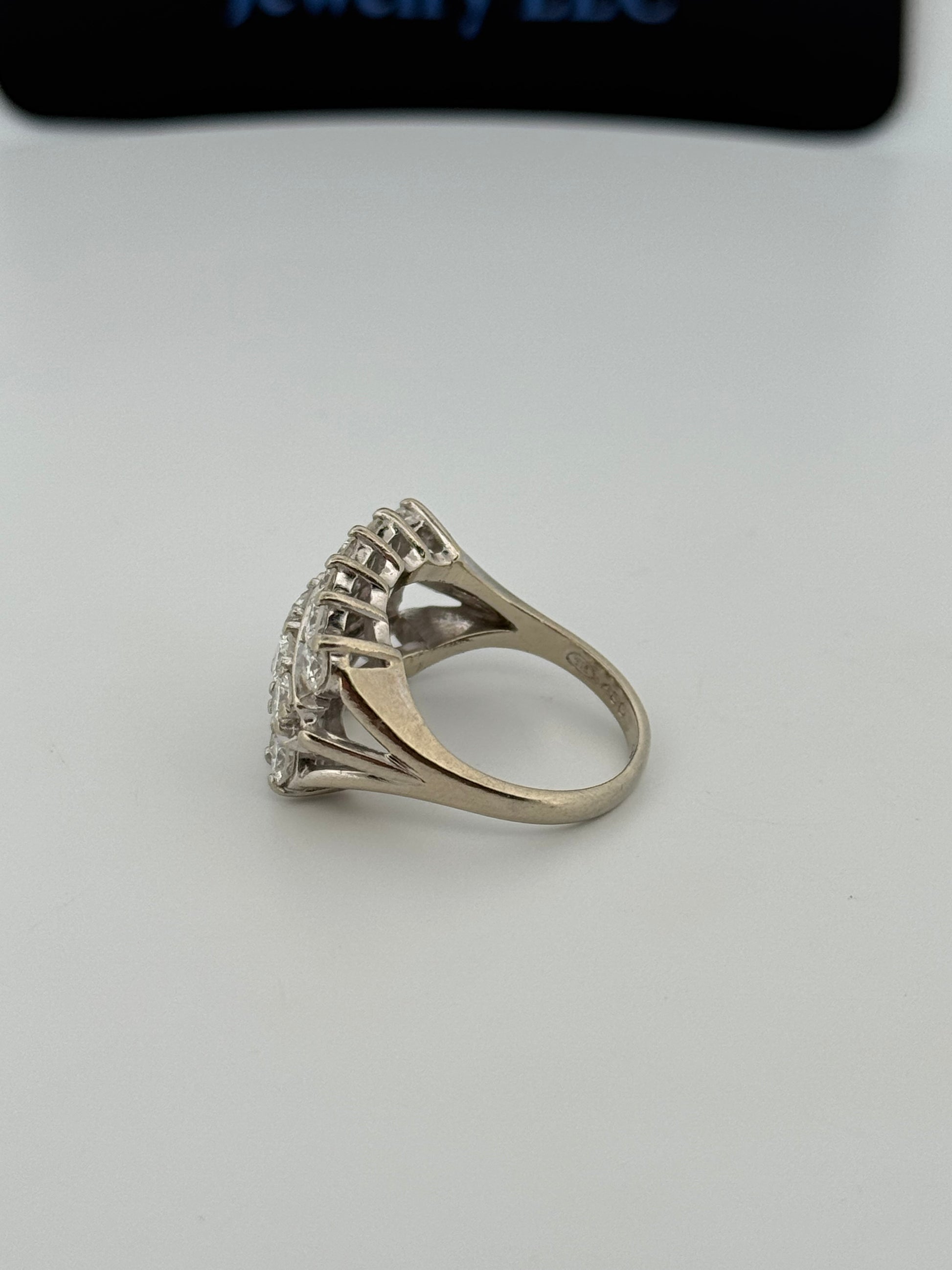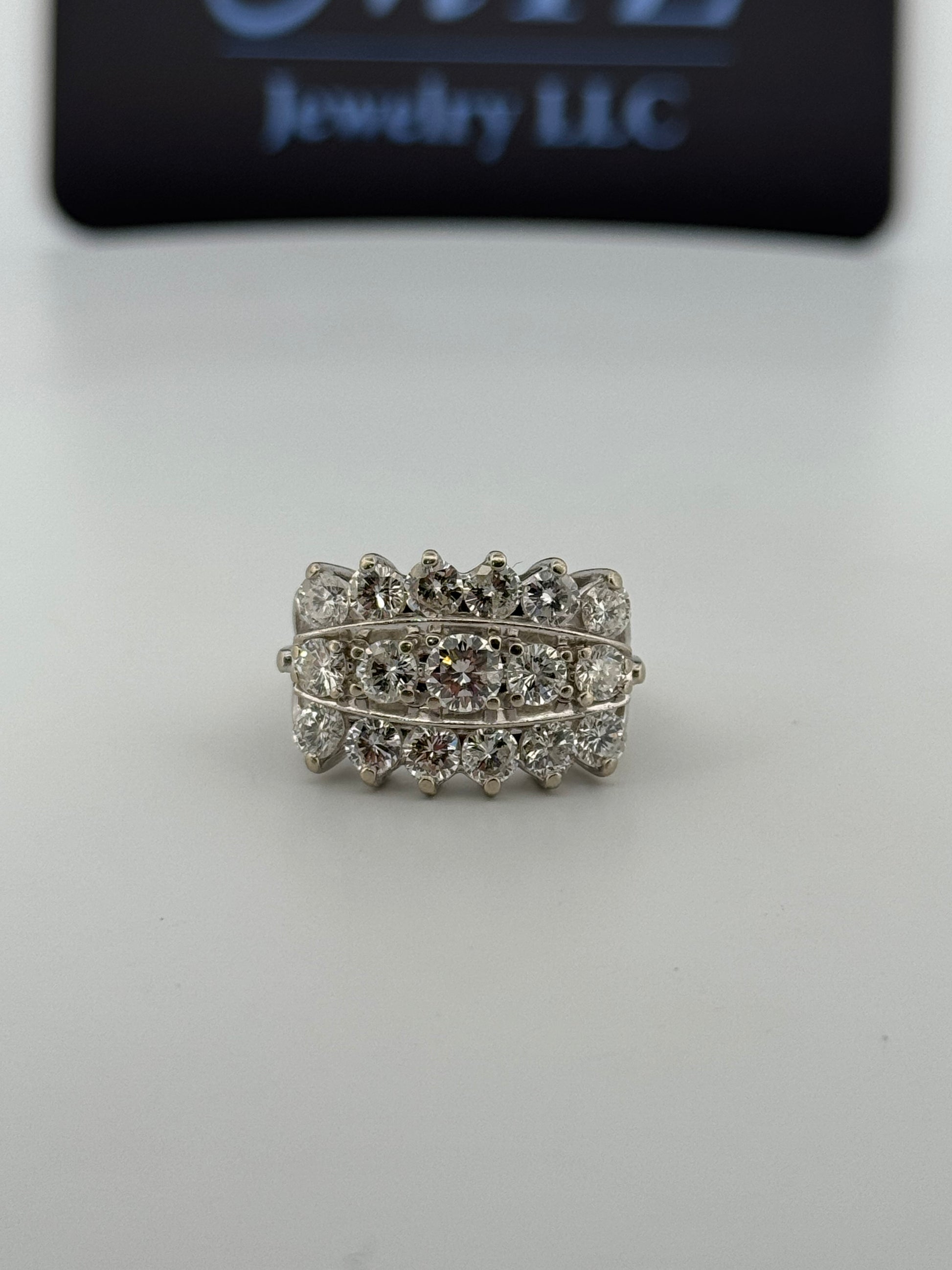 This ring includes 3.09 carats of round diamonds with an estimate clarity and color being I1-i2, g-h. The majority of the stones in this ring are above .10 pointers and the biggest stone in the center is a .38 pointer. The inclusions on the diamonds are almost unnoticeable with the naked eye. No stones are milky or hazy.